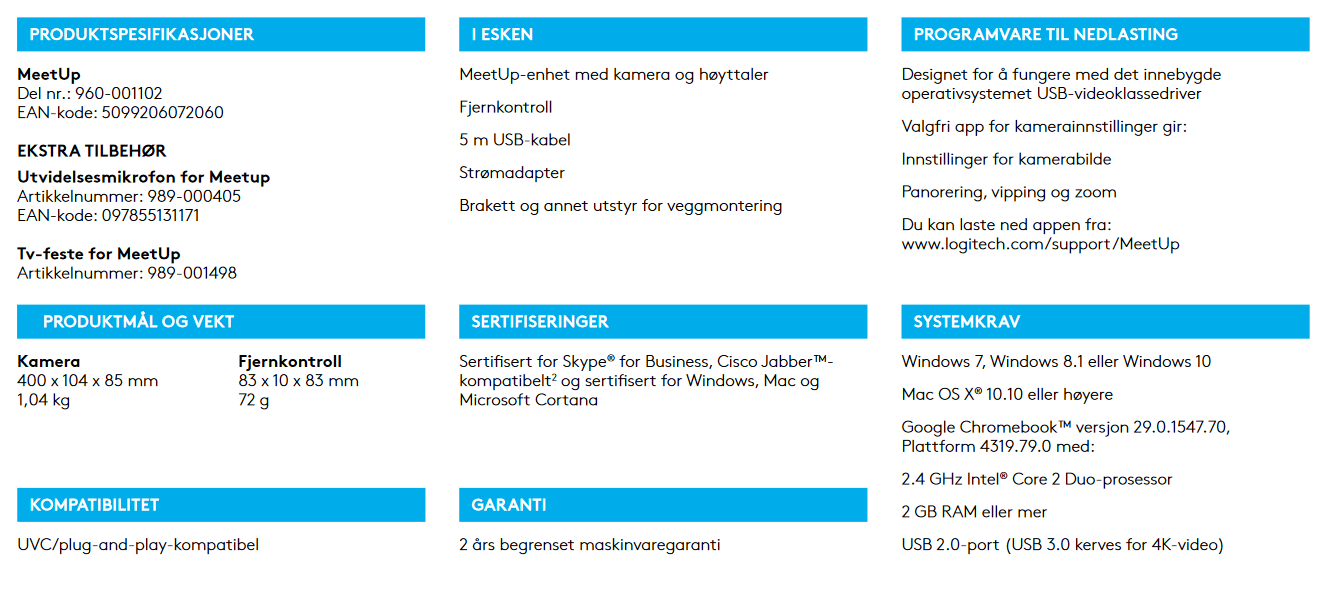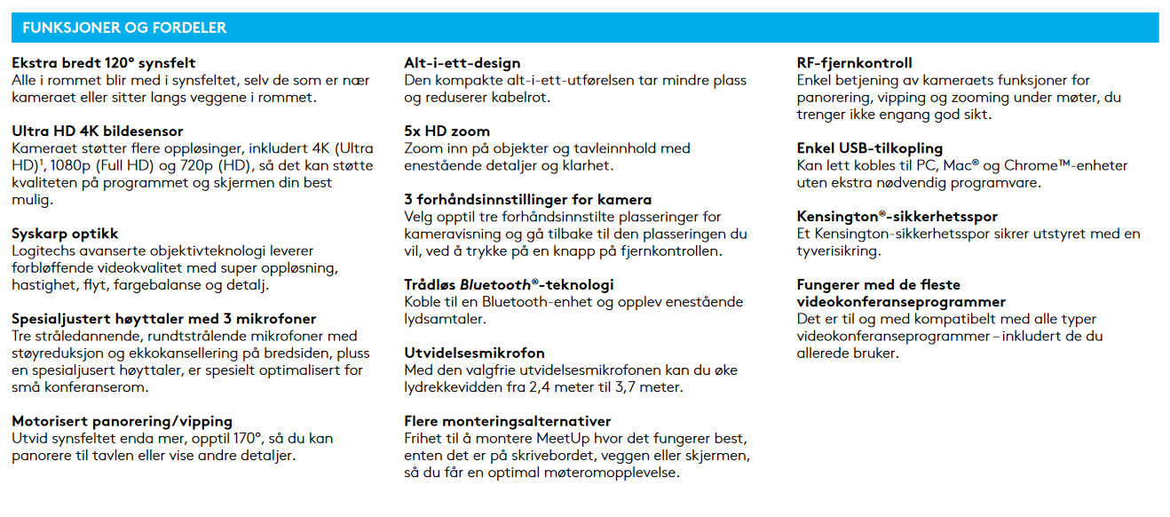 MeetUp er Logitechs ledende ConferenceCam utviklet for små konferanserom og møterom. Bli kvitt rotete kabler rundt bærbare datamaskiner. Med 4K-optikk og et utrolig bredt synsfelt på 120° garanterer MeetUp at alle sitteplassene ved bordet blir med i bildet. Og MeetUps integrerte lyd er optimalisert for akustikken i møterom og sørger for at alle kan både høres og sees.