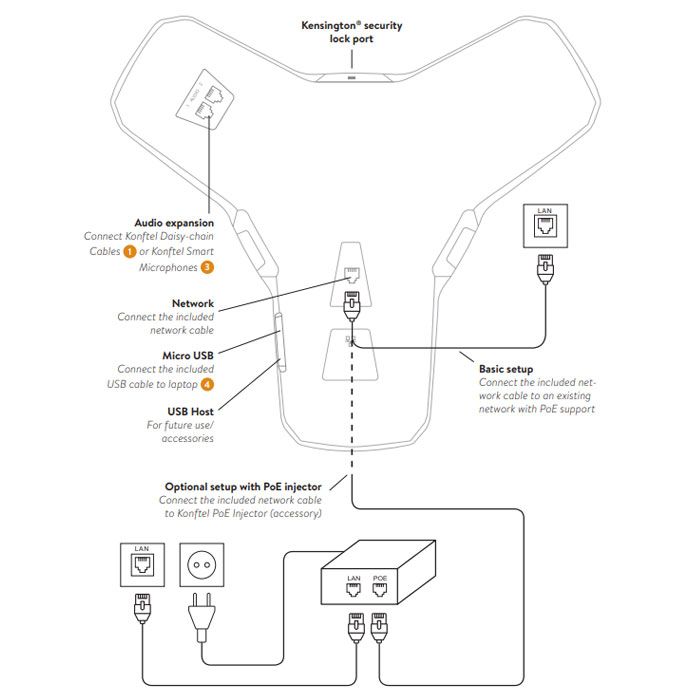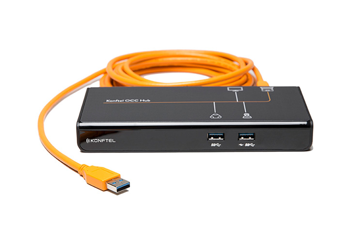 - Konftel OCC Hub forbinder alt slik at det bare er en enkelt USB-kabel for å koble kameraet, lydenheten og romskjermen til din PC/Mac.