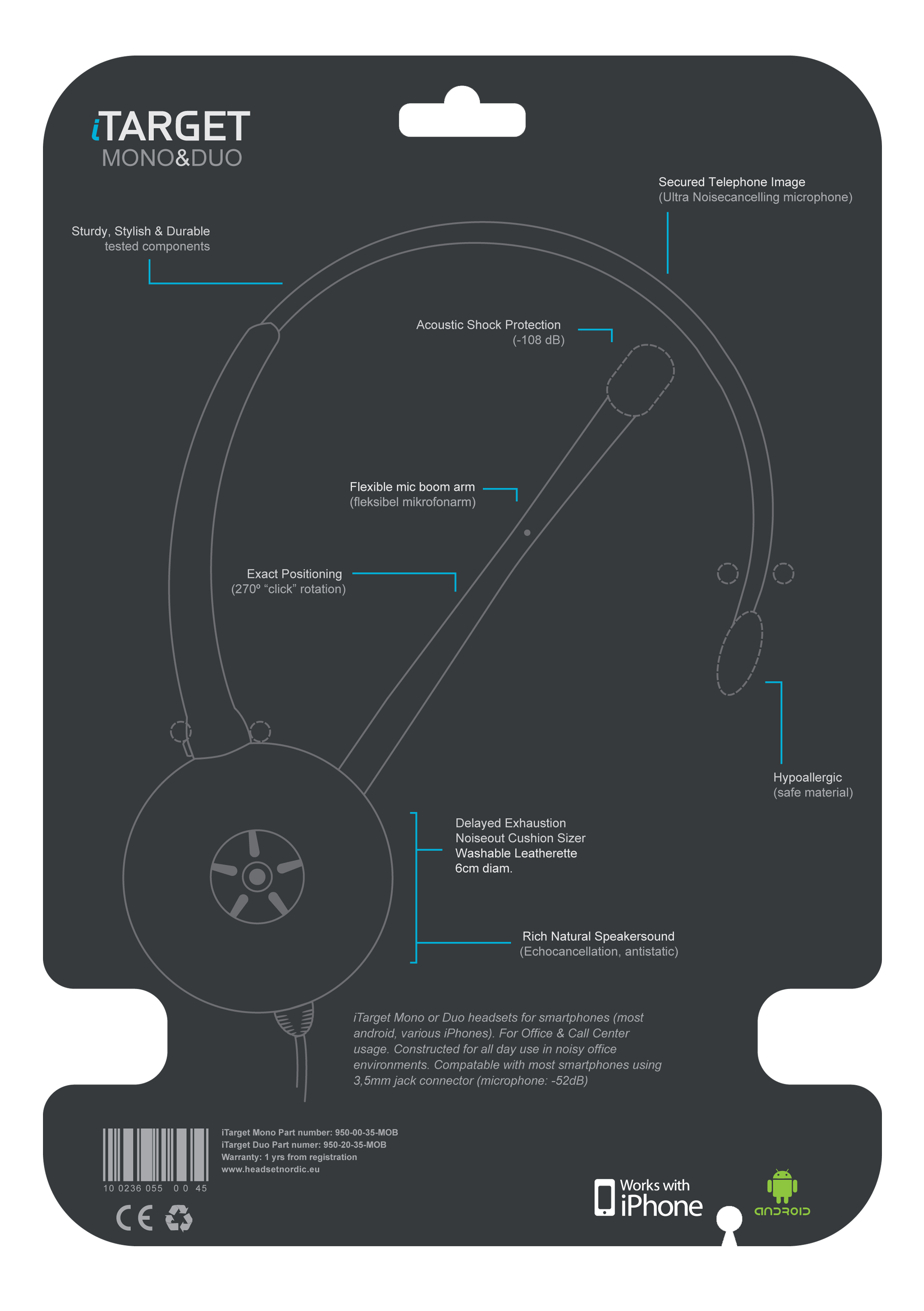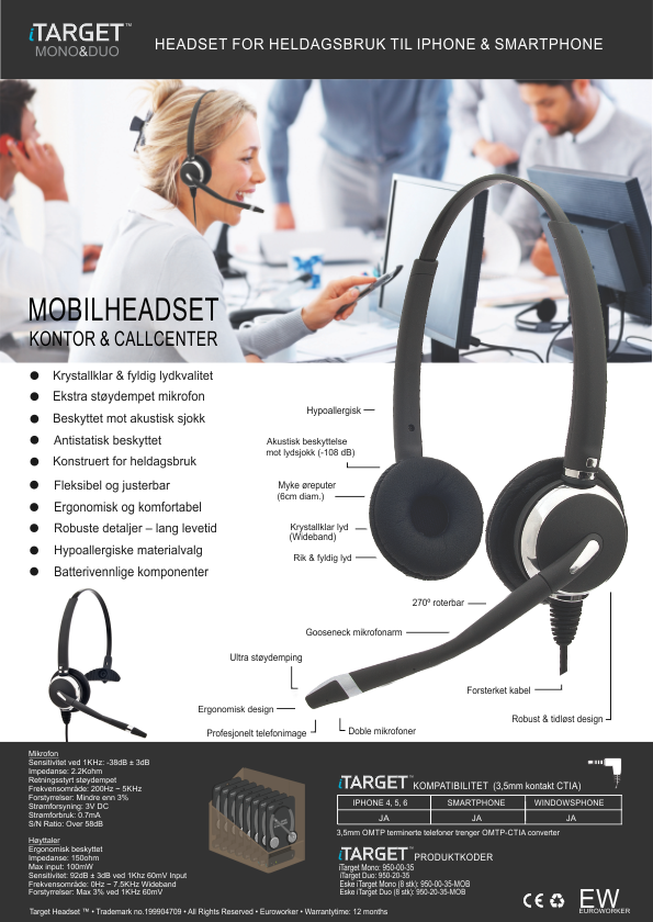Konstruert og utviklet etter tilbakemeldinger fra ansatte som bruker mobilen som primærtelefon på jobb. Populært trådbasert mobilheadset. Egnet for Call Center bruk pågrunn av svært god og støydempet mikrofon. Spesielt konstruert for heldagsbruk i ringemiljøer med moderat bakgrunnsstøy. Utviklet med utgangspunkt i tilbakemeldinger fra brukere.