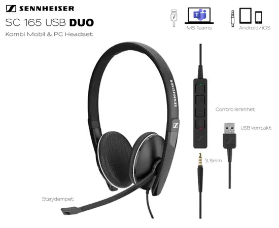 - Kombi stereo headset sertifisert for bruk med MS Teams
