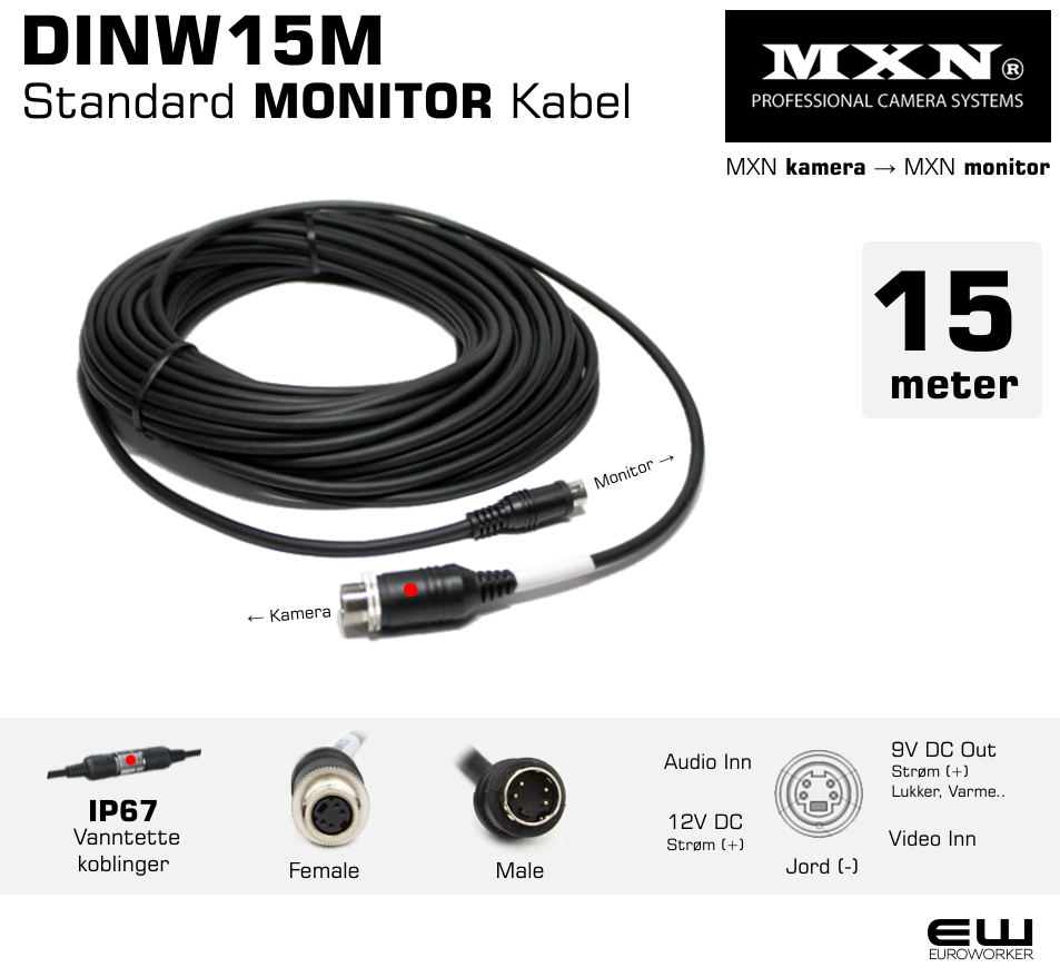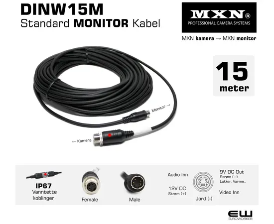 Høykvalitetskabel for installasjon mellom kamera og monitor/LCD: Det er viktig å måle nødvendig kabellengde før du kjøper et kamera. Denne kabelen har en vanntett hunn-kontakt på kamerasiden og en vanlig hann-kontakt på monitor/LCD-siden.