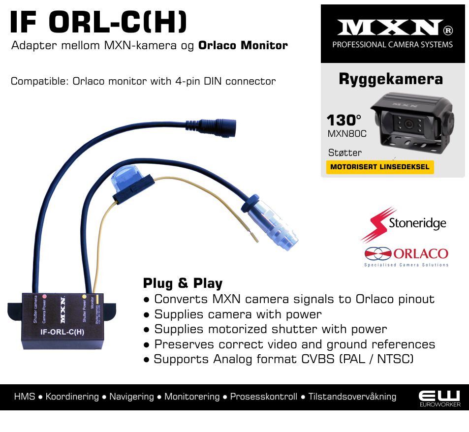 Kompatible kameraer til denne Orlaco: MXN kameraer som støtter analogt CVBS (PAL, NTSC) format