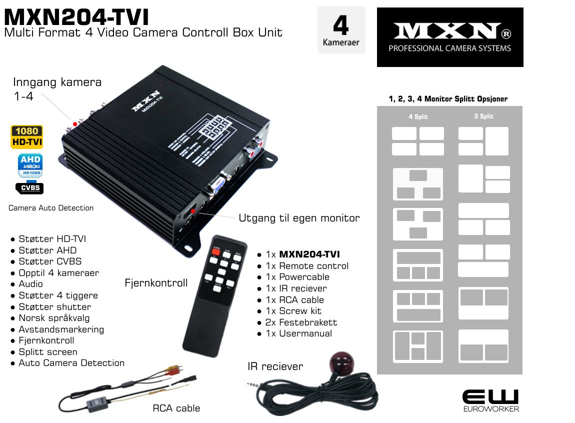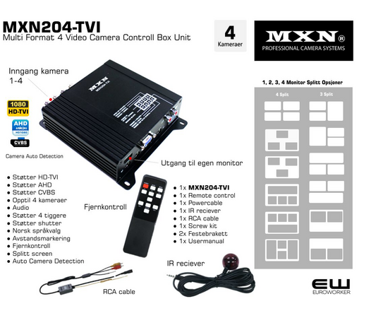 MXN204-TVI er en avansert video multi purpose kontrollboks som lar deg koble inntil 4 kameraer til én monitor med HDMI kabel.