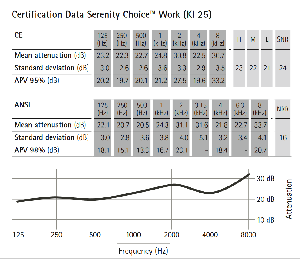 It is certified as hearing protection acc. to CE (EN 352-2) and ANSI (S3.19-1974) as well as ANSI-IPIL (S12.42-2010) when worn together with Serenity Choice™ Pro Security generic earplugs.