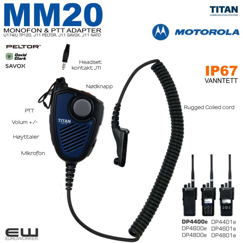- The Titan Remote Speaker Microphone MM20 is a versatile accessory product with front and side PTT. The Nexus connector and 3.5mm jack socket enable users to combine the MM20 with a multitude of audio accessories, making it ideal for users needing to connect helmet audio systems.