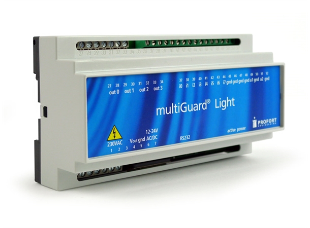 Profort multiGuard® Light er en komplett GSM sende- og mottaksenhet med en inngang til overføring av alarmer fra trådført sensor, en analog inngang til temperaturføler, PT100, 0-10V mm. og en utgang til styring av varme, pumper mm. Enheten har infrarød utgang med "learn"-funksjon til styring av f.eks. varmepumper.