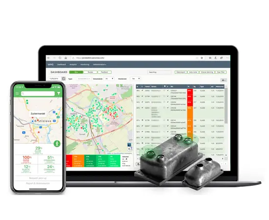 Waste Monitoring solution combines Smart Sensors, Smart Waste Management System and Citizen App. The Smart Sensors use ultrasound technology to measure the fill levels in bins and containers several times a day and send the data to the Smart Waste Management System, a powerful cloud-based platform, via the Internet of Things (Sigfox, NB-IoT, LoRaWAN, GPRS) providing cities and businesses with data-driven decision making, and optimization of waste collection routes, frequencies and vehicle loads, bin distribution resulting in overall waste collection cost reduction by at least 30% and carbon emission reduction up to 60% in cities.
