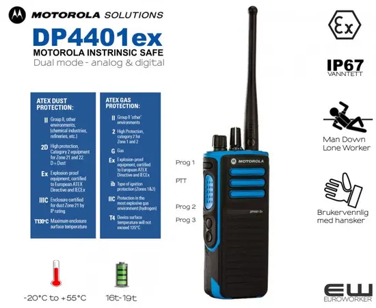 - Klar blå farge sikrer at arbeidere alltid bærer ATEX sertifisert radio i eksplosjonsfarlige soner.