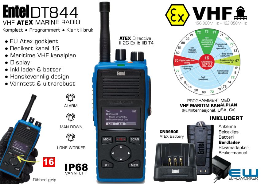 Entel DT844 Marine VHF IIB Atex Radio (Programmert, inkl Batteri og Rapid Charger)