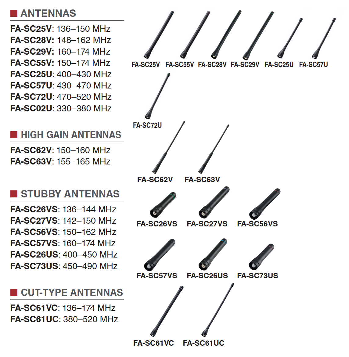 FA-SC61UC: 380–520MHz, ca. 19 cm (justerbar), ingen farge.