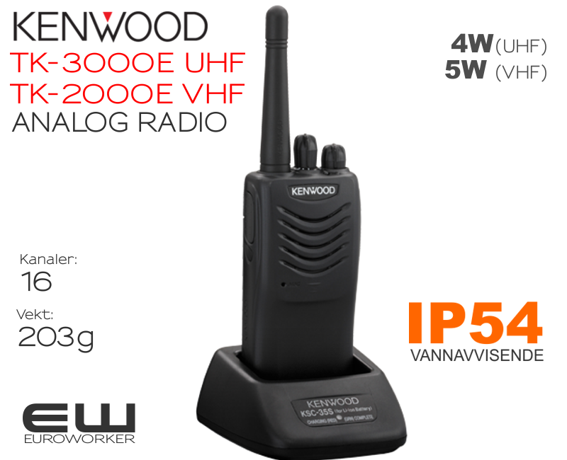 - Komplett lisensiert analog radiopakke (TK-3000E) UHF eller (TK-2000E) VHF analog radio med KNB-63L batteri KRA-27M antenne, KSC-35SE bordlader