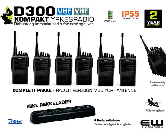 Zodiac D300 6 Pack Kompakt Yrkesradio med rekkelader (IP55, UHF, VHF, Fallsikring)