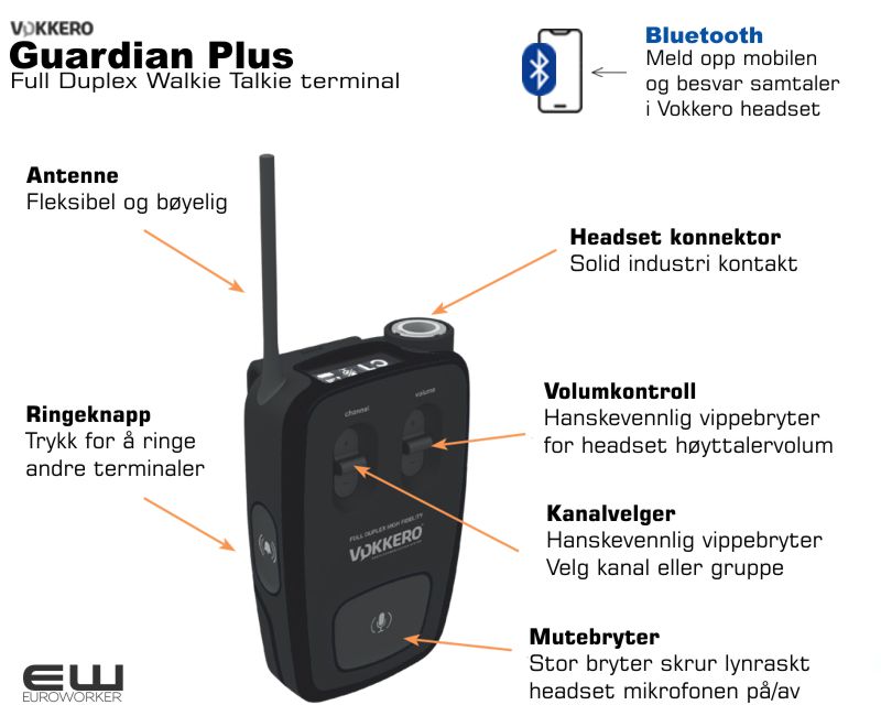 - Guardian Plus har bluetooth - meld opp headset eller meld opp mobilen og tale inn/ut & strømming