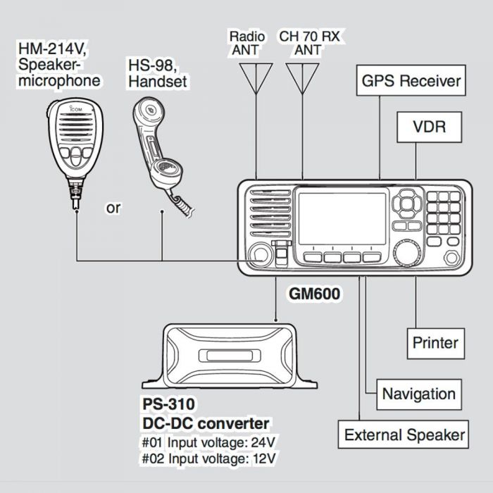 The PS-310 DC-DC converter supplies a stable 12.6 V of power to the GM600 from either a 12 V or 24 V power source (depending on version) and provides a floating ground connection. The PS-310 protects the radio from momentary power interruption. The PS-310 must be used with the GM600 for MED certification compliance.