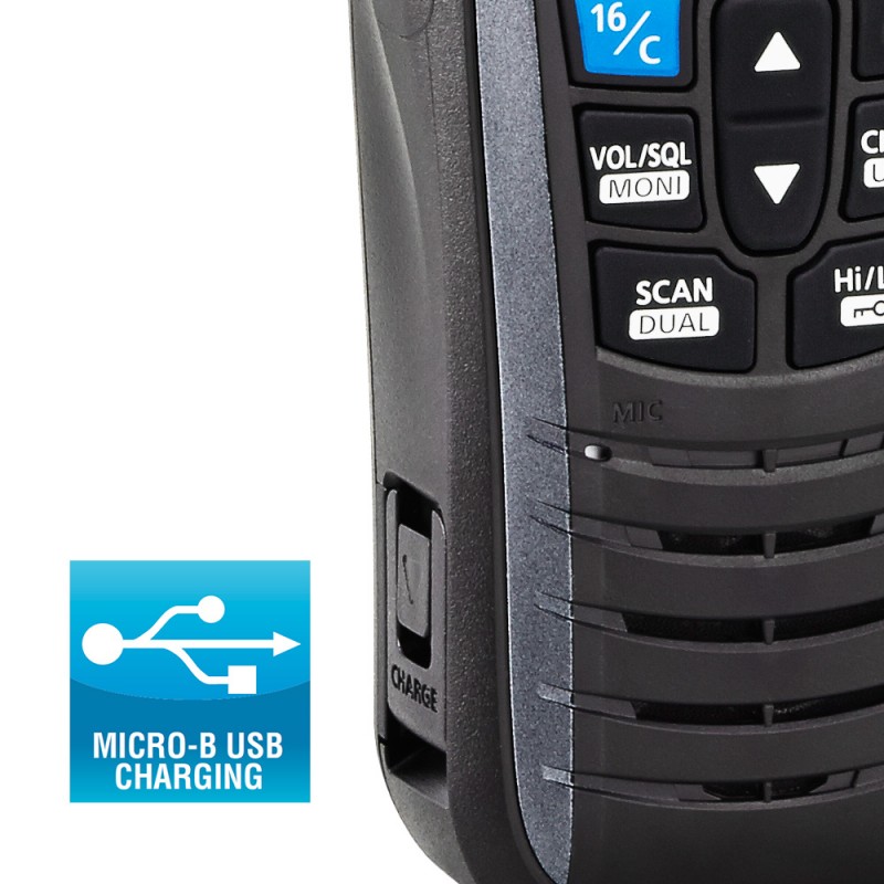 Radioen veier kun 220 gram noe som gjør den til en av markedets letteste og minste flytende VHF radio. Både knapper og display er bakgrunnsbelyst for enkelt betjening når det er mørkt.