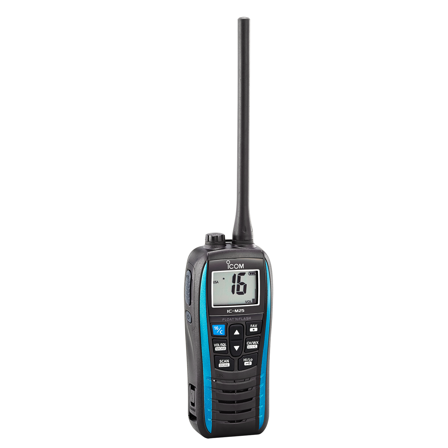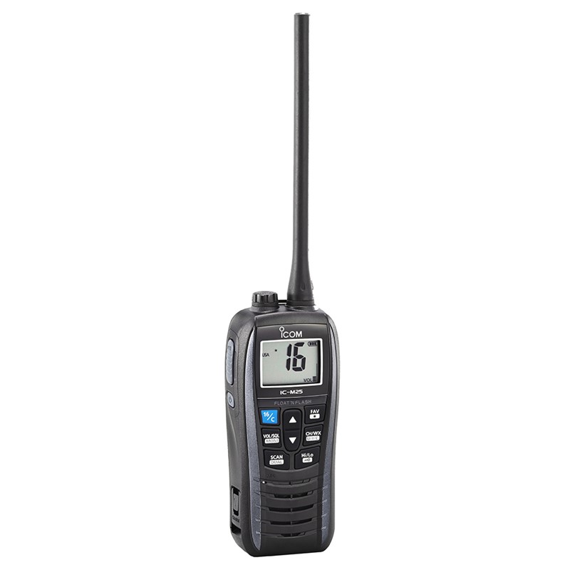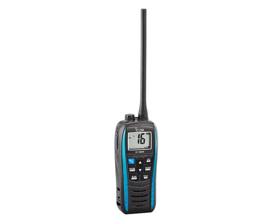 IC-M25 lades med en standard USB-kontakt og lading kan skje både via en sigarett kontakt eller en powerbank. Som option finnes det en vanntett monofon noe som gjør at IC-M25 kan bæres i beltet. Radion flyter faktisk med monofonen montert på radioen.