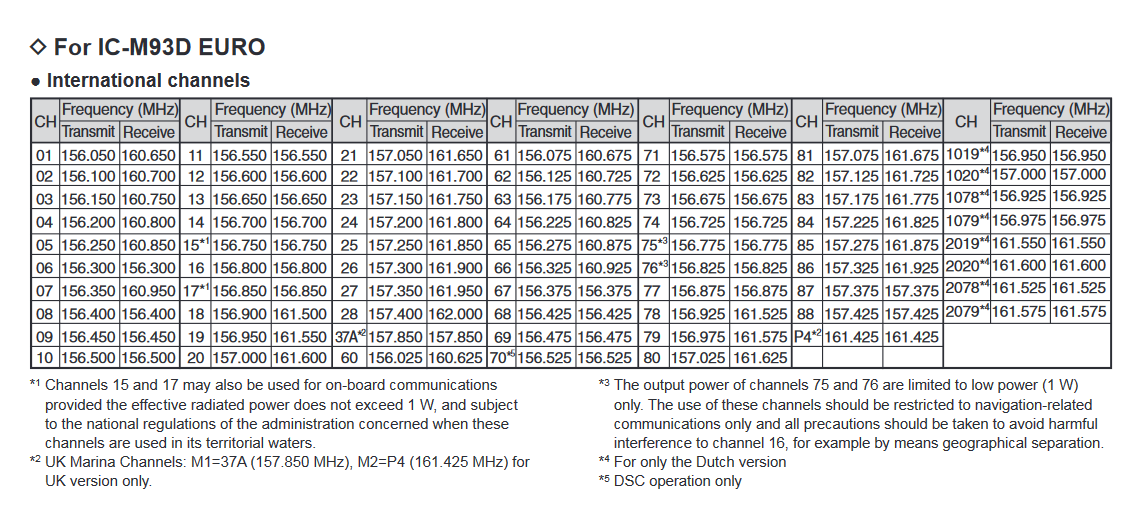 156.025–157.425 MHz 156.050–163.275 MHz 156.525MHz |
