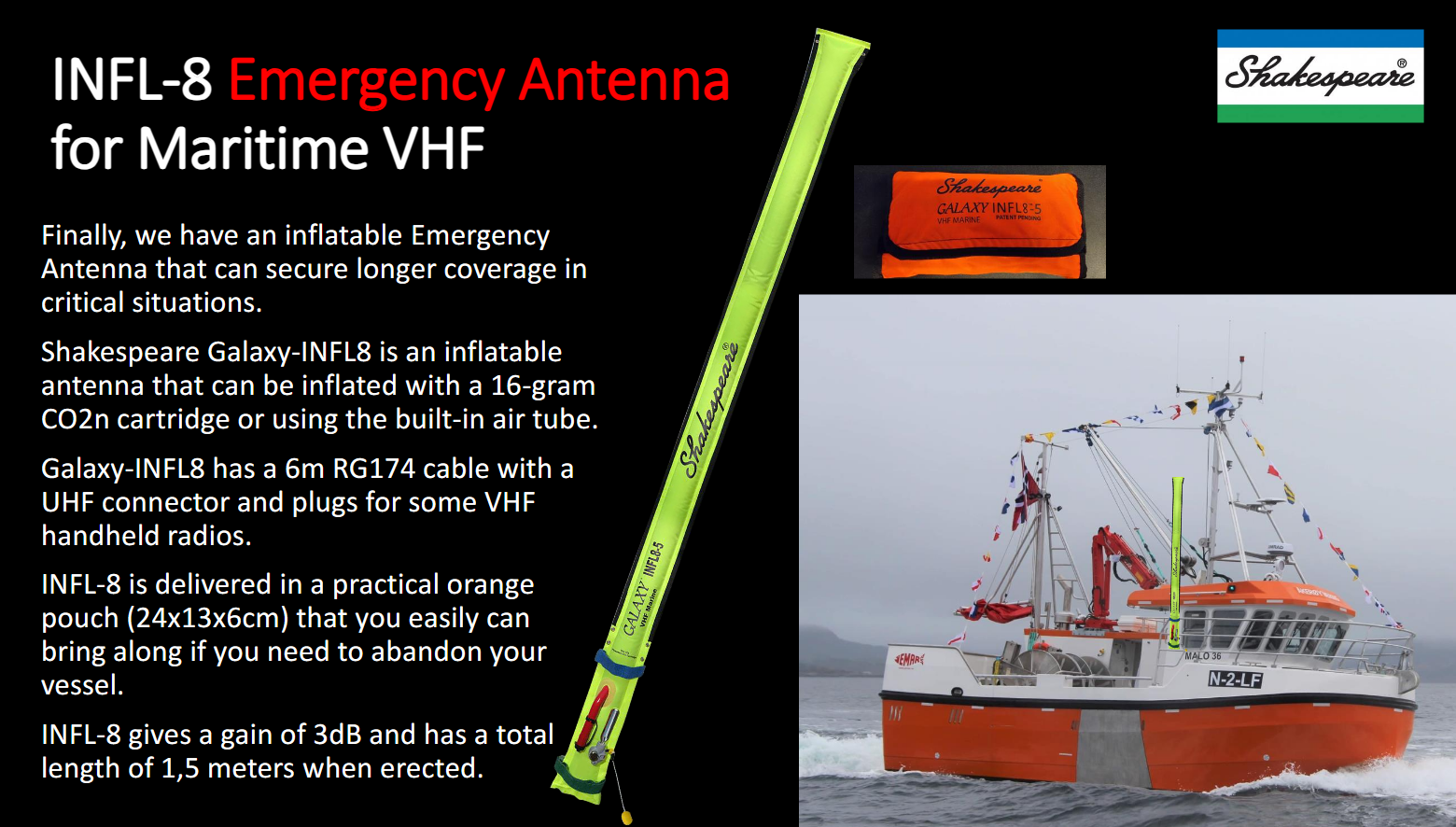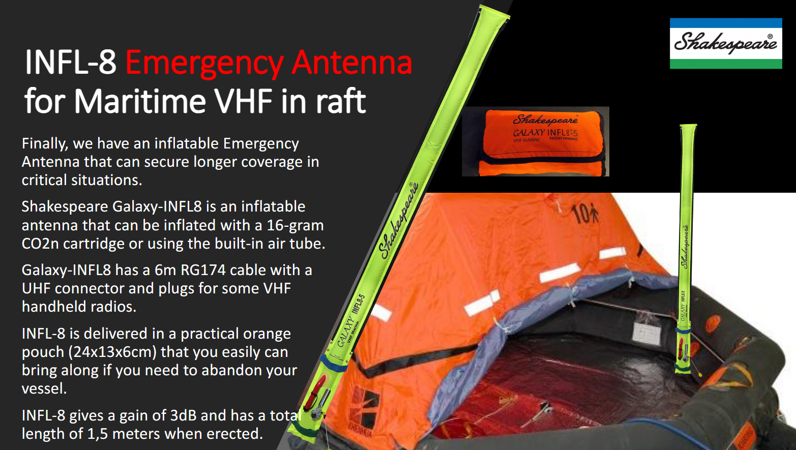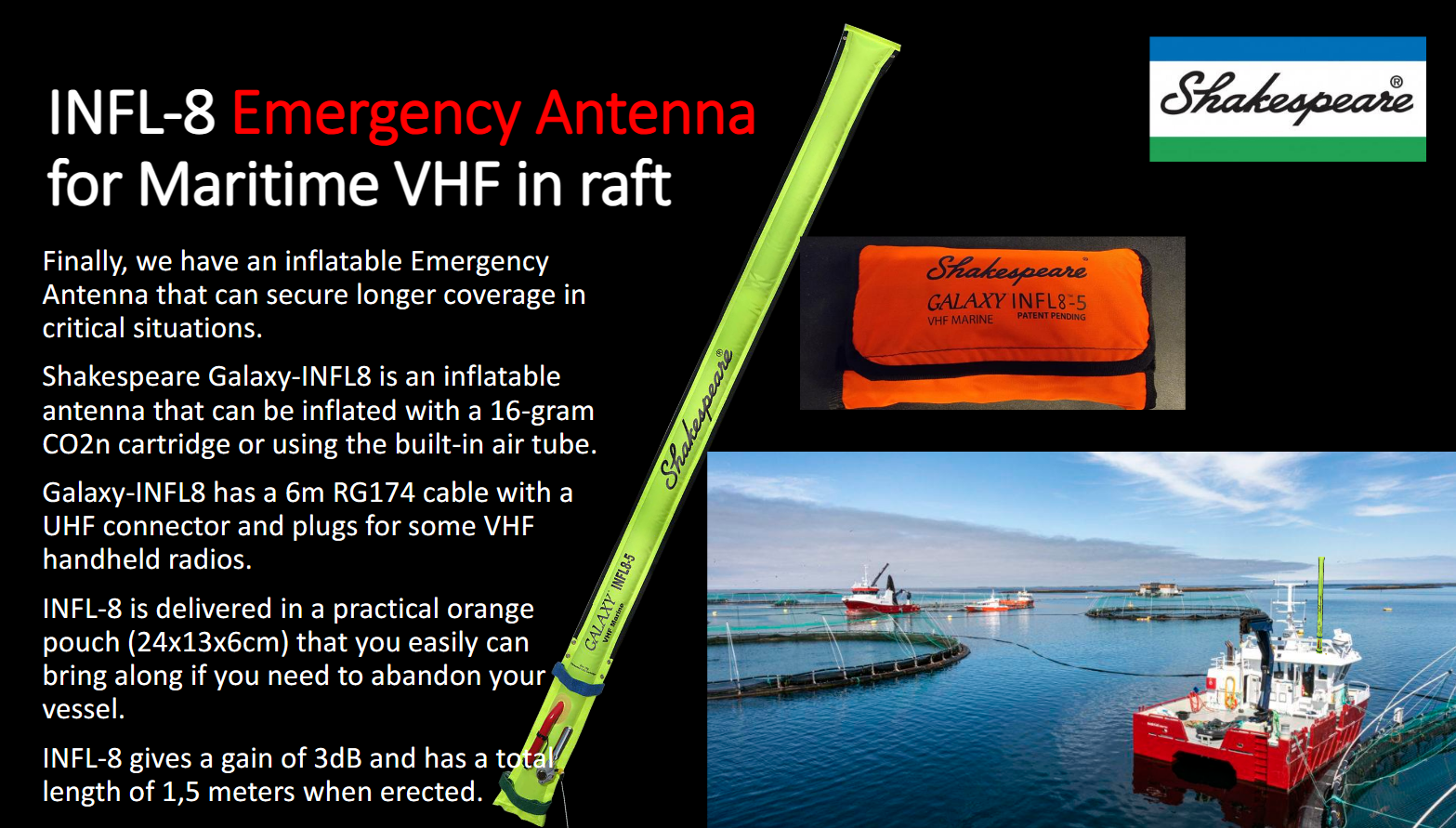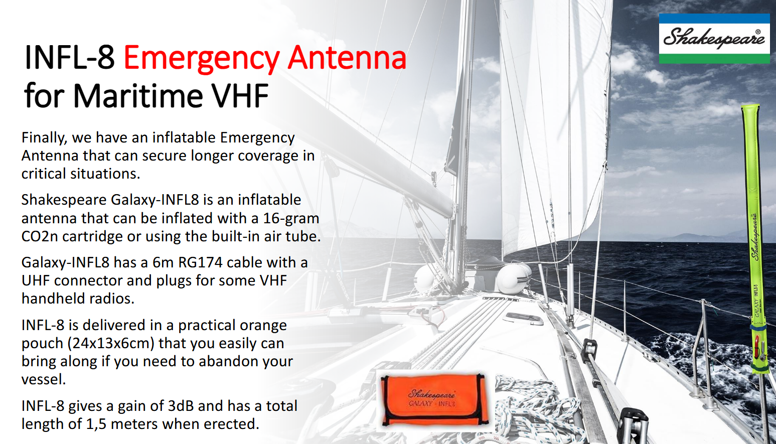 En oppblåsbar nødantenne som Shakespeare Galaxy INFL8-5 (3dB, 1,5m) gir en betydelig fordel sammenlignet med en standard antenne på en håndholdt VHF-radio. Her er de viktigste fordelene:
