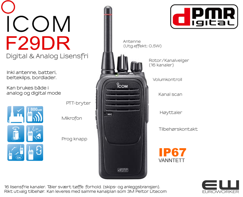 - Kun 3 kontrollbrytere - PTT eller sendeknapp, volum, kanalvelger - slik enget i bedrifter med høy turnover.