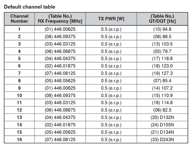 RX Frequency [MHz] TX PWR [W] QT/DQT [Hz]