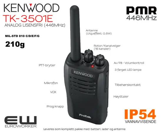 - Kenwood TK-3501E PMR (446MHz) Lisensfri Analog Radio (0,5W)