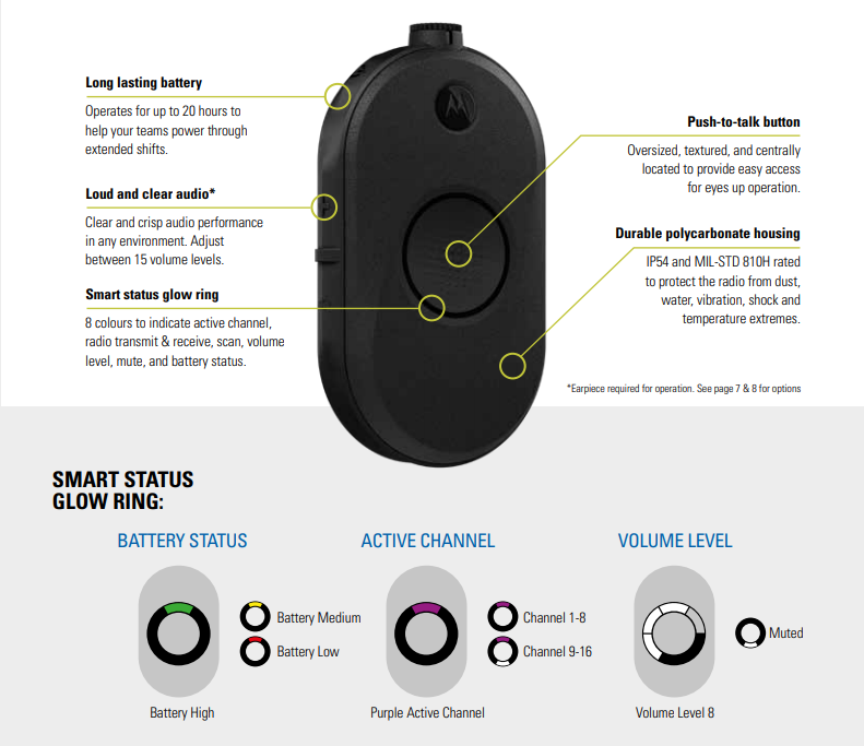 - Flerfarget LED lys indikerer med farge kanalen som er i bruk - gjør det enkelt å kommunisere internt.