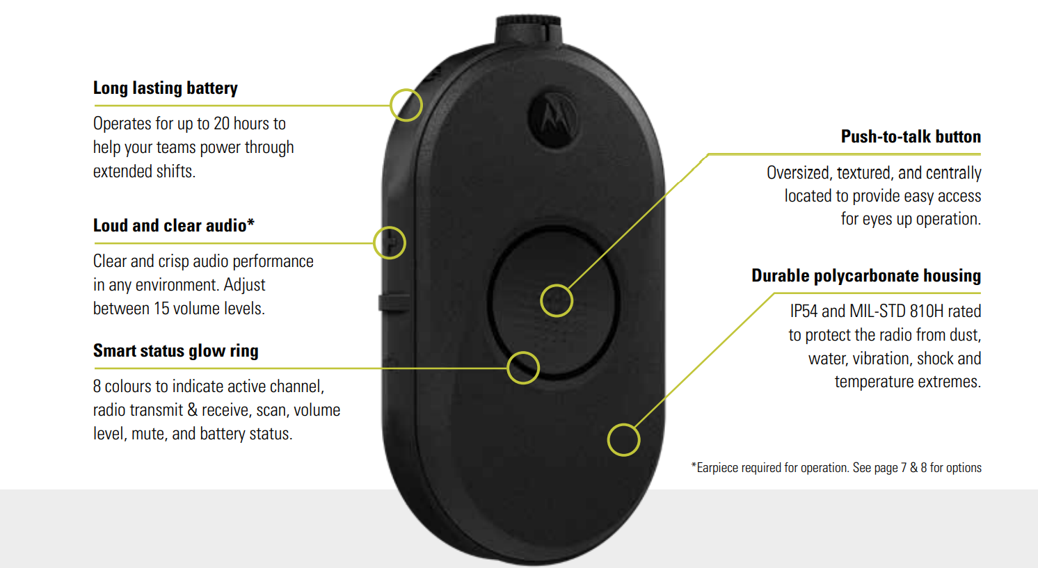 - Stor PTT knapp med tektuert overflate for intuitiv betjening.