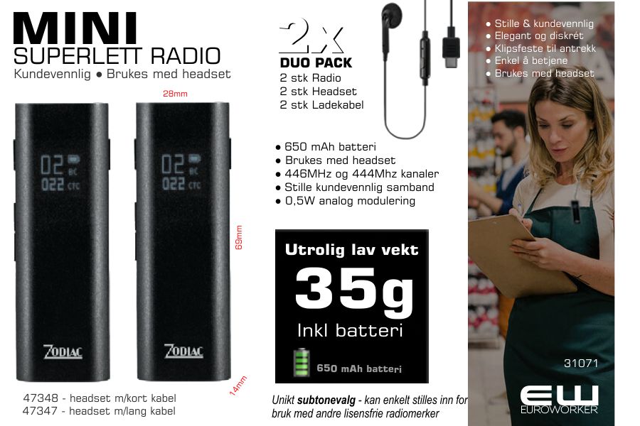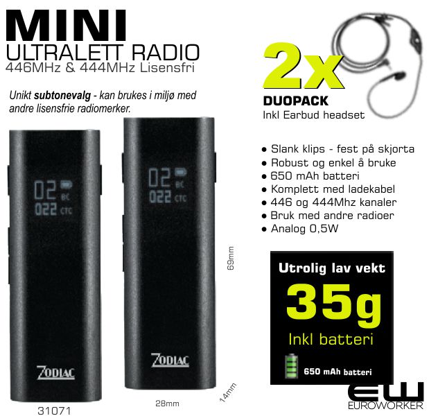 Zodiac Mini 446 Duo Pack – Liten & Lett Lisensfri radio for butikk og retail (446 & 444MHz)