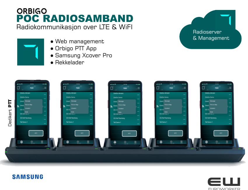- POC enheter kommuniserer umiddelbart via Orbigo PTT kommunikasjonsserver som ligger trygt i skyen.