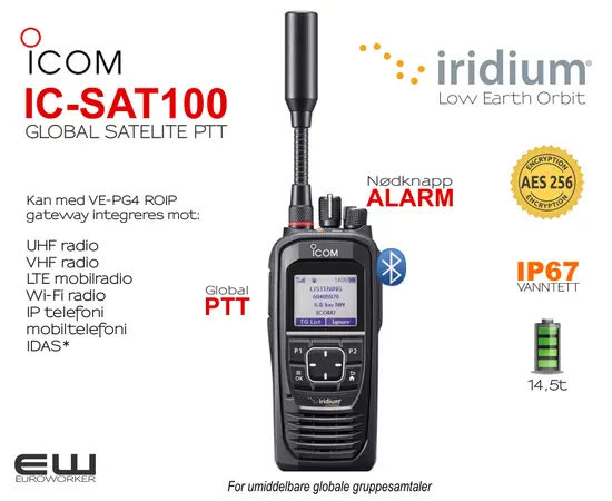 IC-SAT100 er Icoms første satellitt PTT-radio som bruker Iridiums satellittkonstellasjon. I motsetning til vanlige satellittelefoner, vil IC-SAT100 tilby radio til brukere ved å trykke på en knapp (PTT). Den kan brukes som et kommunikasjonsverktøy på eksterne, isolerte steder der det ikke finnes mobiltelefoner eller fastnettinfrastruktur, f.eks. fjellområder, fjerntliggende øyer, ørkenområder, etc. Selv om den jordbaserte infrastrukturen er tilgjengelig, kan menneskelig påvirkning eller naturkatastrofer gjøre satellittkommunikasjon en viktig og kritisk sikkerhetskopi.
