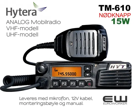 HYT TM-610 leveres med mikrofon, 12V kabel, monteringsbøyle og manual.