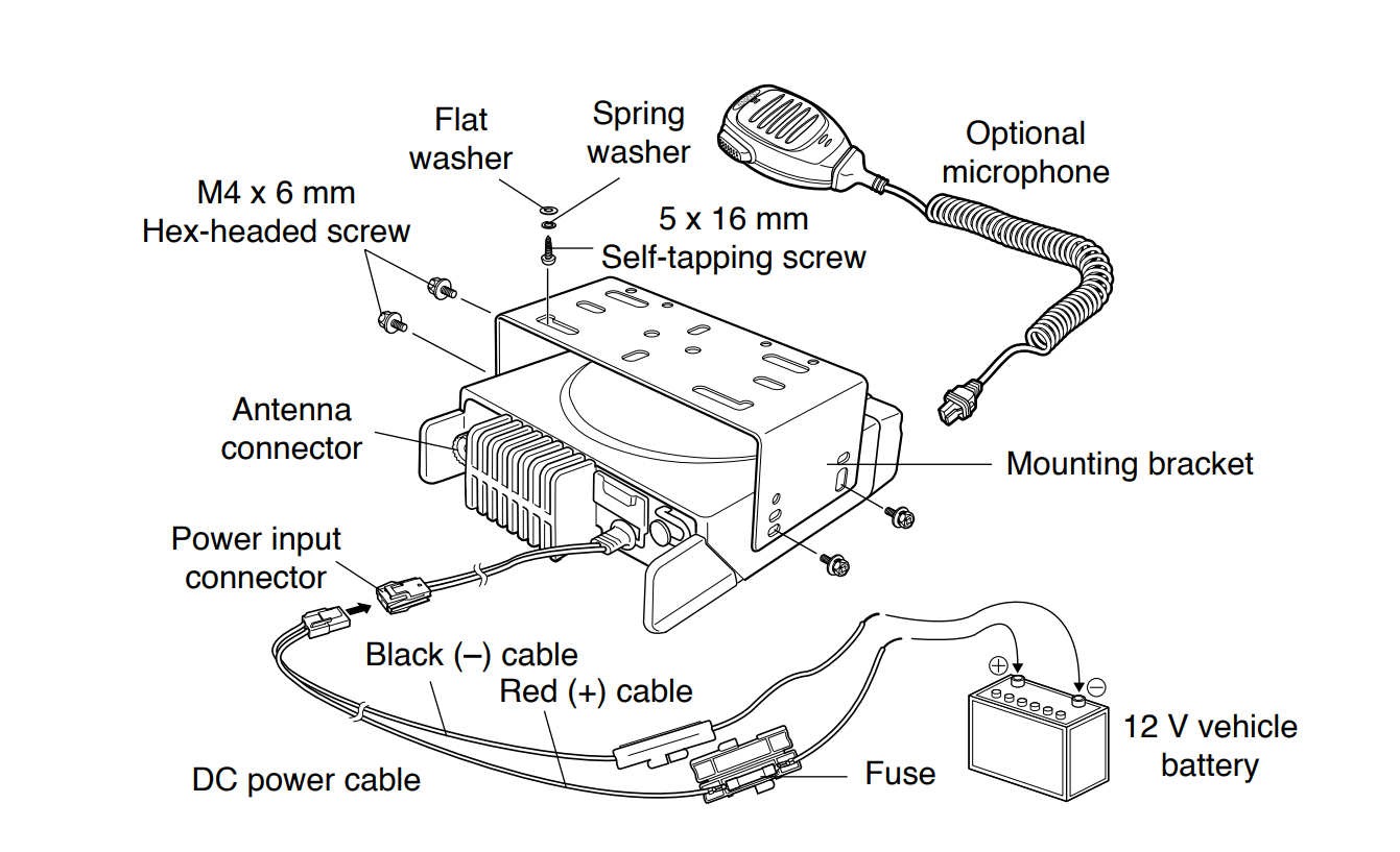 - Innhold: radio, festebrakett for bilmontering, batterikabel med sikring og håndholdt mikrofon (monofon)