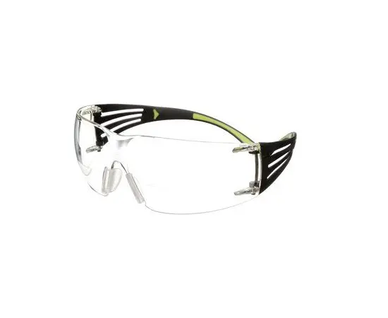 3M SecureFit™ vernebrille med styrke, SF425AS/AF-EU, sort/grønn innfatning, ripebestandig/anti-dugg, klart +2,5 glass. Brilleglasset har ekstra +2,5 styrkeflet nederst på glasset som forstørrer små detaljer. Flate og fleksible brillestenger gjør at de er komfortable å bruke og passer svært godt sammen med 3M øreklokker 3M Pressure Diffusion Temple-teknologi (PDT) bidrar til å fordele trykket ved tinningen og justerer seg naturlig til ulike hodestørrelser for en behagelig og sikker passform. Holder seg på plass, selv ved mye bevegelse. Myke og justerbare neseputer for enda bedre passform.