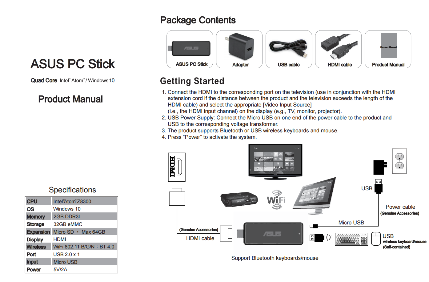 ASUS Stick PC QM1 is equipped with a quad-core Intel® Atom processor to deliver responsive performance and high-quality graphics for uncompromised computing experiences. Together with up to Windows 10 Home, high- speed storage, Wi-Fi, Bluetooth, and other connectivity options, it is ready to help you get work done or keep you entertained. Despite its tiny size, ASUS Stick PC QM1 provides wide expandability options. Whether you want to attach peripherals or upgrade your storage space, it has you covered with built-in USB and HDMI ports, and a micro SD card slot.