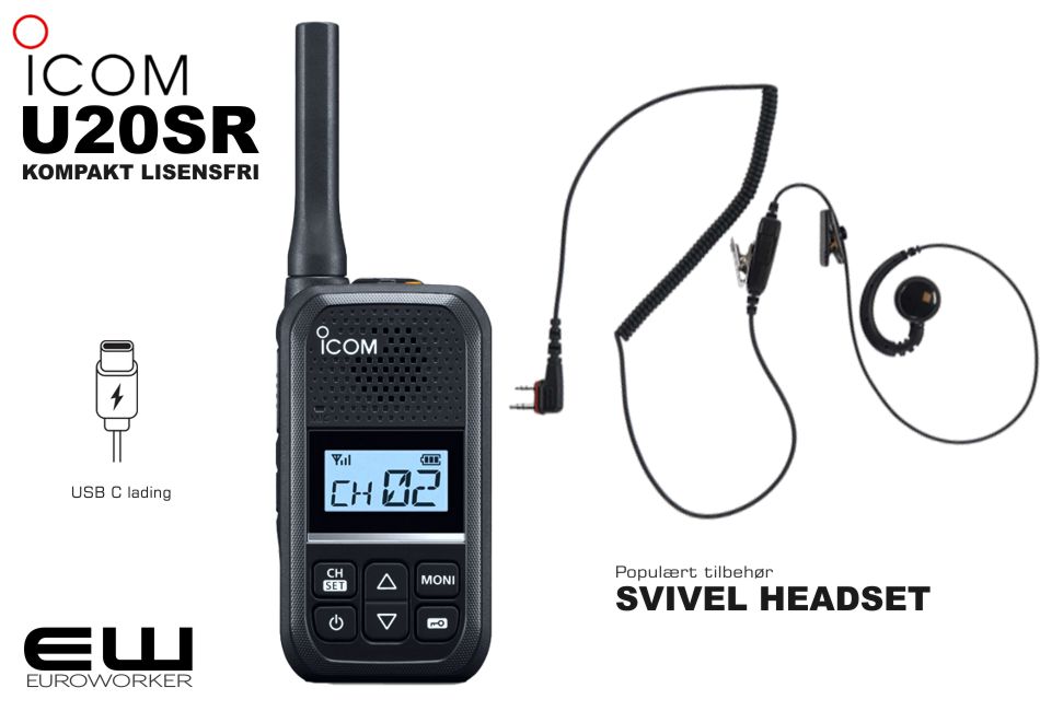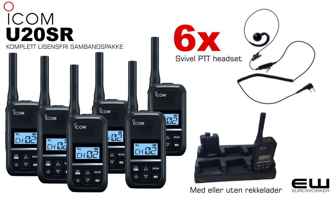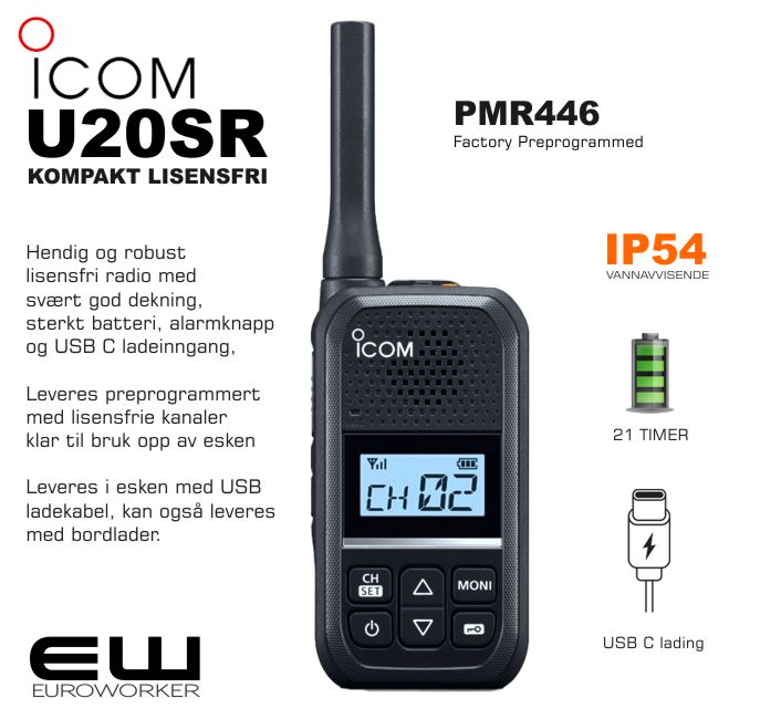 OM ICOM U20SR - Sender med 0,5W. Utstående frekvenstunet antenne gir ekstra god dekning sammenlignet med tilsvarende radioer