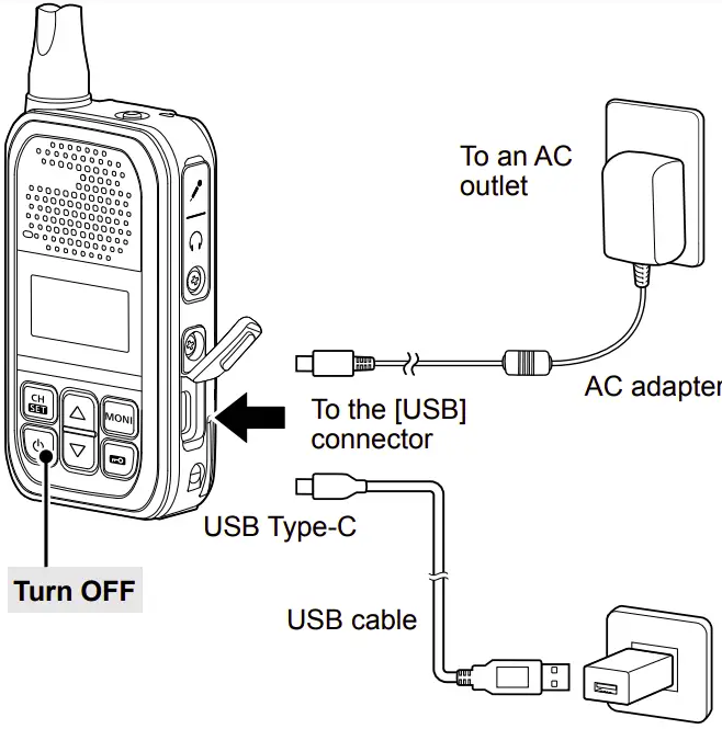 There are three different ways of charging the IC-U20SR. In addition to charging with the BC-262 charging cradle, there is a direct radio body connection charging with USB Type-C cable* and charging BP-304A with a BC-264 battery charger.