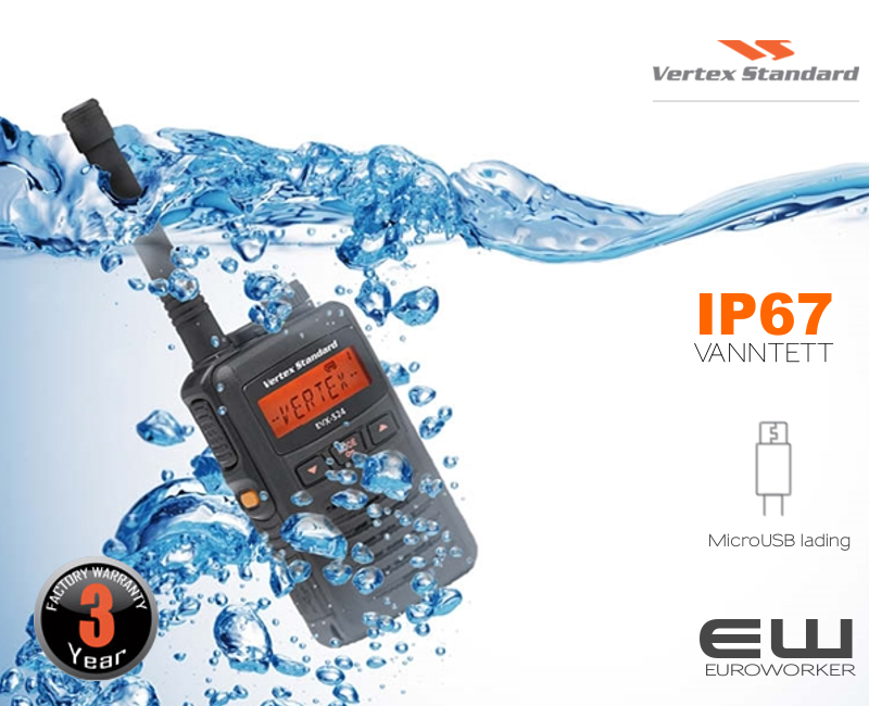 - EVX-S24 oppfyller den internasjonale IP67 standarden og er både vann- og støvtett. Den tåler nedsenking i vann opptil 3 meter (1 meter) i 30 minutter og er fullstendig beskyttet mot støv.