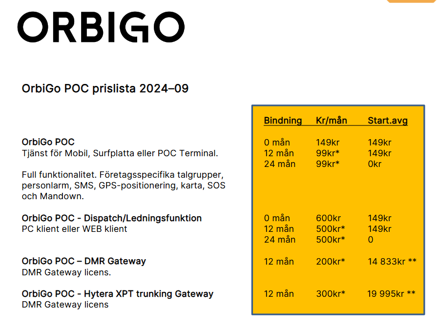 - 1 eller 2 års Orbigo PoC abonnement - som gir calling tjeneste over internet. Ved 2 års binding er det ingen oppstartsavgift og lavere månedlig abonnementspris.