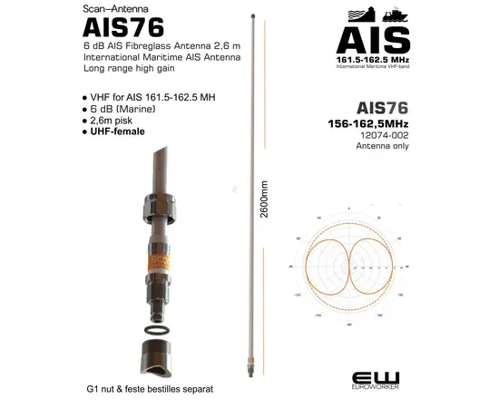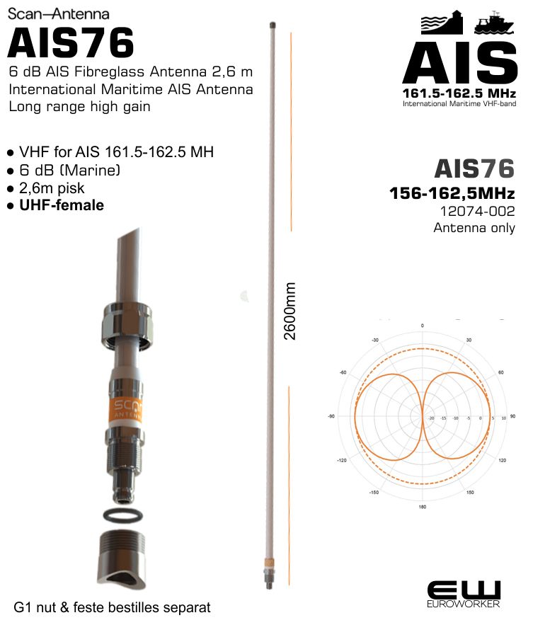 Scan Antenna AIS76 er en høykvalitets glassfiberantenne på 2,6 meter, konstruert for profesjonell bruk i det internasjonale AIS-båndet (161.5 - 162.5 MHz). Dette er en full 1/2 λ dipol-antenne som gir et stabilt, rundstrålende signal uten behov for jordplan.