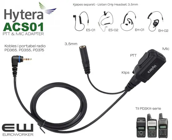 - Hytera PD3 serie PTT adapter med MIC for 3,5mm tilkobling av Hytera Listen Only Earpiece Headset: