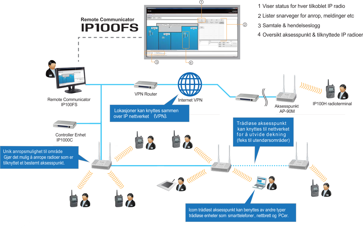 - Server som styrer all kommunikasjon med IP100H IP radio i trådløse nettverk