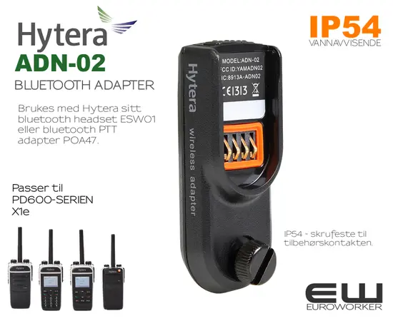 - Brukes med Hytera sitt bluetooth headset ESW01 eller bluetooth PTT adapter POA47.