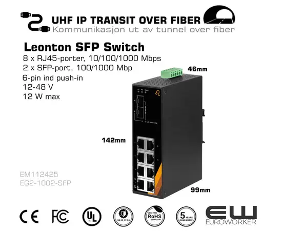 EG2-1002-SFP er en 10-ports Gigabit Ethernet switch i et robust metalhus med integrert DIN-skinnefeste. Montering i skap/kabinett eller på vegg.