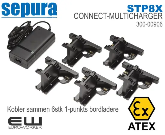 - Strømforsyning (PSU) og klips-sett for sammenkobling av 6 stk Sepura STP8X SIngle PSU Bordladere