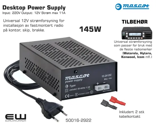 - Universal strømforsyning som passer for bruk med de fleste radiomerker (Motorola, Hytera, Kenwood, Icom mfl.)