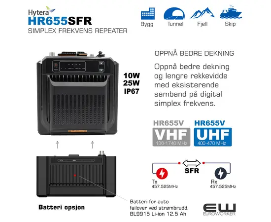 Hytera HR655 er en DMR-repeater som er spesifikt designet for å fungere i en Single Frequency Repeater (SFR)-modus. Denne funksjonaliteten krever en egen programvarelisens, som du må kjøpe og aktivere for å bruke modusen.