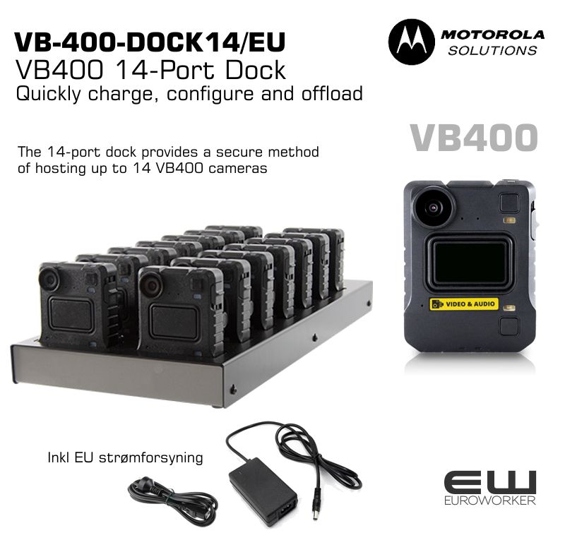 Charge, configure and offload footage from up to 14 VB400 body-worn cameras. Quickly charge, configure & offload footage from VB400 body-worn cameras. The 14-port dock provides a secure method of hosting up to 14 VB400 cameras for small and medium-sized sites.