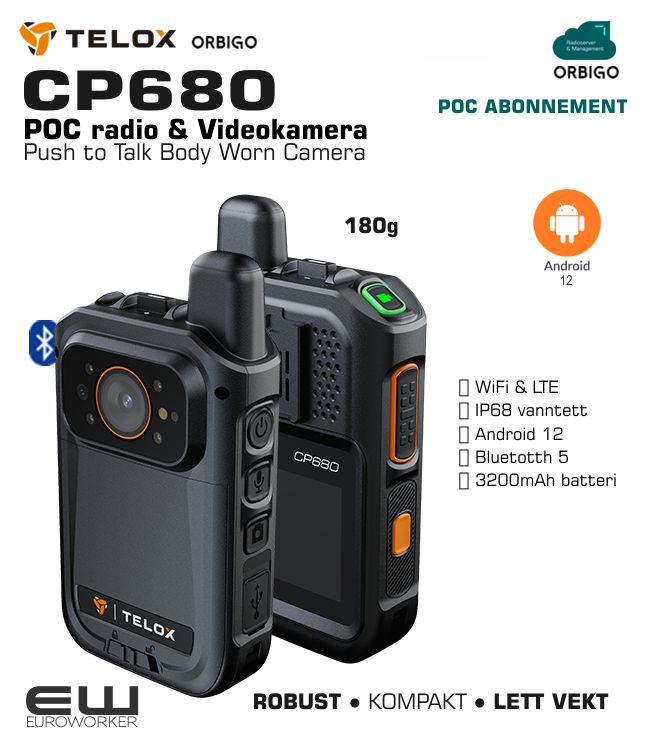 - Telox CP680 Push to Talk Body Worn Camera (Android 12, IP68, BT 5.0)