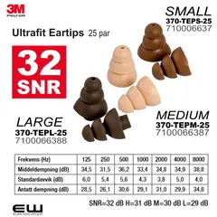 Pris gjelder 25 par (50 stk) Peltor Eartip tetningspropper Høy dempning: 32 SNR Velg størrelse fra menyen: 370-TEPS-25 7100066371 Ultrafit Eartips Small 25 par 370-TEPM-25 7100066387 Ultrafit Eartips Medium 25 par 370-TEPL-25 7100066388 Ultrafit Eartips...