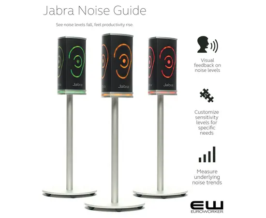 - Identifiserer støyen - Jabra Noise Guide er en portabel enhet som i tillegg monitorerer støynivåene og gjør medarbeidere mer bevisst hvilken betydning støyen de lagrer har på arbeidsmiljøet. Kan derfor brukes som et verktøy for å identifisere "bråkmakere" og skape et tema om å å være med på å skape mer stille omgivelser.